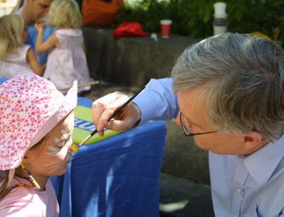„So etwas habe ich noch nie gemacht“, meint Rektor Gantner zur kleinen Simone. Die Sechsjährige ließ sich dennoch bereitwillig vom Rektor als Gänseblümchen schminken. Auch die kleine Christie, bemalt als Katze, hatte mit ihren acht Jahren keine Scheu vor dem Chef der Uni. Gebannt warten Simone und Christie nach dem Schminken auf die Aufführung der Theatergruppe „Tatzelbein“, die eines der Highlights des Kinderfestes an der Uni darstellt.