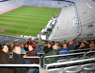 Die Allianz Arena ist derzeit eines der modernsten Fußballstadien der Welt. Die LFU Innsbruck ließ sich in Kleingruppen die beeindruckende Architektur und Geschichte der 340 Millionen teuren Fußballarena erklären. Die Heimstätte des FC Bayern und des TSV 1860 München bietet über 60.000 Fußballfans selbst auf den obersten Tribünen beste Sicht und die Möglichkeit, das Geschehen auf dem Rasen hautnah mitzuerleben. Nach der Besichtigung der Kabinen von Oliver Kahn bis Michael Ballack konnte die Reisegruppe Ulli Höneß beim Dreh eines Werbespots beobachten.