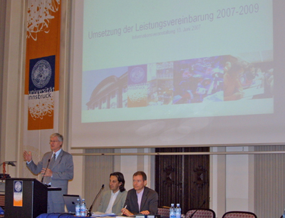 „Wir haben Sie heute eingeladen, um sicherzustellen, dass möglichst alle Betroffenen bestens über die Leistungsvereinbarung 2007-2009 informiert sind“, begrüßte Rektor Gantner die Anwesenden in der Aula. „Da die Universität für das Erreichen der festgeschrieben Ziele verantwortlich ist, sind wir selbst unseres Glückes Schmied.“