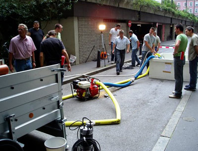 Es mussten 1.800 l Wasser mit Hilfe der benzinbetriebenen Schmutzwasserpumpe sowie mit einer strombetriebenen Tauchpumpe abgepumpt werden. In Bereichen, wo Wasser in die Gebäude eindringen könnte, wurden die gefährdeten Stellen mit Hilfe von Hochwasserschutzwänden - die auf vorbereiteten Wandschrauben befestigt wurden - abgeschottet. In weniger als einer Minute wurden die 1.800 Liter Wasser aus dem Becken ausgepumpt. Insgesamt können mit allen verfügbaren Pumpen pro Minute 4.600 Liter abgepumpt werden.