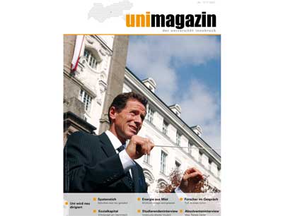 Am 12. Oktober wurde das neue Rektorat der Uni Innsbruck um Rektor Karlheinz Töchterle mit vier VizerektorInnen komplettiert. Die aktuelle Ausgabe berichtet von der Inaugurationsfeier und stellt das neue Rektorenteam vor. Außerdem gibt es wieder interessante News aus Forschung, Lehre und Verwaltung.