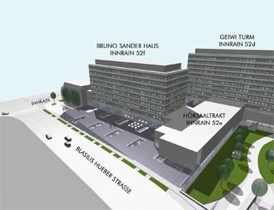 Um die Öffnung zur Innenstadt räumlich darzustellen, ist es vorgesehen das Geiwi-Forum auf das Niveau der Eingänge der Gebäude Innrain 52d und Innrain 52f anzuheben. Weiters soll sich die Fläche des Forums ostseitig bis zur Blasius Hueber Straße erstrecken. Das neue Forum ist zusätzlich von der Universitätsbrücke kommend verlaufend ebenerdig erschlossen, im Bereich der derzeitigen Bushaltestelle Blasius Hueber Straße erfolgt der Zugang zum Forum über Sitzstufen (siehe Bild). Diese Baumaßnahmen sind derzeit für die intensive Lärmentwicklung im Bereich der Gebäude Innrain 52d und Innrain 52f verantwortlich. Trotz aller Bemühungen von Seiten des Leitungsteams und der OE Gebäude und Infrastruktur, ist es leider nicht möglich diese Lärmentwicklung gänzlich zu unterbinden, weil die bestehenden und abzutragenden Betondecken nicht anders entfernt werden können. In Abstimmung mit dem Bauherrn BIG, wurde am 23.07.2008 vereinbart, dass die lärmintensiven Schremmarbeiten mit dem Bagger an den Tagen Mi. 23.07, Do. 24.07, Mo. 28.07. Di. 29.07 und Mi. 30.07. in der Zeit von 14:00 bis 19:00 Uhr stattfinden.