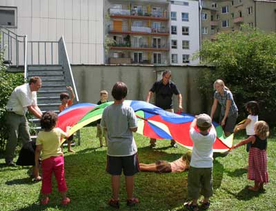 Auf der kleinen Terrasse steht ein blitzblaues, mit Wasser gefülltes Kanal- und Schleusensystem aus Plastik, auf dem einige Schiffe treiben – das Lieblingsspielzeug der Kinder an heißen Tagen, wie die Leiterin des Kinderbüros, Sabine Fischler erzählt. Auch sonst sind die Räumlichkeiten im Parterre der Josef-Hirn-Straße 5-7 vorübergehend kindergerecht gestaltet: Die großen Tische und Stühle wurden gegen bunte Kindermöbel getauscht und jede Menge Bausteine, Bücher, Puzzles und Spiele sind im Raum verstreut. Die drei bis zehnjährigen Gäste scheinen sich hier sehr wohl zu fühlen, und auch die Organisatorinnen des Projekts, Sabine Fischler und Gabriele Ferdig, sind zufrieden: „Unser Büro im ADV-Gebäude wird gerade umgebaut. Wir sind froh, dass wir für die Ferienbetreuung ein so nahes und geeignetes Ausweichquartier gefunden haben“, so die beiden. Möglich wurde diese Lösung durch das Entgegenkommen des Universitätspfarrers Msgr. Hippler, der die Räume unbürokratisch zur Verfügung stellte, um die gelungene Betreuungsaktion zu ermöglichen.