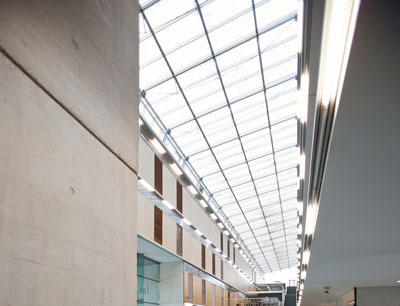 „Insgesamt wurden seitens des Gebäudeeigentümers Bundesimmobiliengesellschaft (BIG) über zwei Millionen Euro in die Neukonstruktion der 2000 Quadratmeter großen Dachfläche investiert“, so BIG-Geschäftsführer Christoph Stadlhuber. Nach Entfernung der alten Glaselemente wurde eine neue Pfosten-Riegel-Konstruktion aus Aluminium montiert. „In die Pfosten-Riegel-Konstruktion wurde eine normenkonforme Isolierverglasung nach den gültigen Sicherheitsstandards eingebaut wobei die untere Scheibe aus 12 mm dickem Verbundsicherheitsglas (VSG) besteht, die im Bruchfall eine große Resttragfähigkeit aufweist. Die obere Scheibe ist aus heiß gelagertem, 8 mm dickem Einscheibensicherheitsglas (ESG – H ) hergestellt und für Wartungs- und Reinigungszwecke begehbar. Im Falle des Bruches der äußeren Scheibe übernimmt die innere Scheibe die erhöhten Lasten“, so die Beschreibung des verantwortlichen Architekten Peter Pontiller.