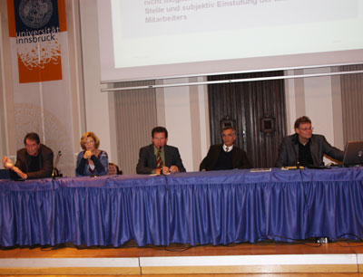 Vizerektorin Margret Friedrich nutzte zu Beginn die Gelegenheit, sich bei den Mitarbeiterinnen und Mitarbeitern in der Verwaltung für ihre zusätzliche Arbeit zu bedanken, die im Zuge der Bologna-Reform und durch die Änderungen bei den Studiengebühren nötig geworden sind. Diesem Dank schloss sich auch Rektor Töchterle an. Er informierte die anwesenden MitarbeiterInnen über die anstehenden Leistungsvereinbarungsverhandlungen mit dem Ministerium und betonte, dass die gute Verhandlungsposition der Universität Innsbruck vor allem auf den ständigen Einsatz und das Engagement ihrer MitarbeiterInnen zurückzuführen ist. „Ich möchte aber nicht verschweigen, dass in den nächsten Jahren auch Sparmaßnahmen notwendig sein werden“, so Töchterle. Trotz dieser Sparmaßnahmen wolle die Universität aber weiterhin sichere Arbeitsplätze gewährleisten. „In einzelnen Fällen, die wir sehr genau prüfen werden, kann es sein, dass wir Stellen nicht nachbesetzen“, erklärte er und richtete einen Appell an die Anwesenden, diese Entscheidungen mitzutragen.