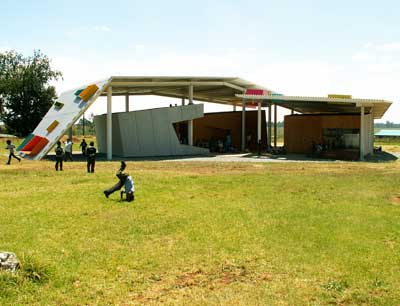 Unter Einbeziehung der lokalen Bevölkerung und unterstützt durch südafrikanische Partnerbetriebe stellten die Jungarchitekten in sechs Wochen die gesamte Vorschule auf und gestalteten auch einen Freibereich für 800 SchülerInnen.