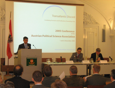 Konzipiert wurde die Konferenz von Carola Bielfeldt, Franz Eder, Gerhard Mangott und Martin Senn (alle Institut für Politikwissenschaft). Unter dem Titel „Transatlantic Discord. Combating Terrorism and Proliferation, Preventing Crises“ führte das Innsbrucker Konferenzteam namhafte internationale Experten zusammen. Dazu gehörten Robert I. Rotberg von der Harvard Kennedy School of Government, Robert S. Litwak vom Woodrow Wilson Center und Jonathan Clarke vom CATO Institute in Washington, Dana Allin vom International Institute for Strategic Studies in London, Fraser Cameron vom Centre for Public Policy in Brüssel, Matthias Dembinski von der Hessischen Stiftung für Friedens- und Konfliktforschung in Frankfurt, Jürgen Wilzewski von der Universität Kaiserslautern sowie Oliver Thränert und Reinhard Rummel von der Stiftung Wissenschaft und Politik in Berlin.