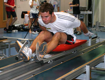 Die Implementierung des Bandantriebes sowie die Messplatztauglichkeit erfolgten in Kooperation mit der Firma Siemens. Die Effizienz der Beschleunigungsschläge wird von zwei synchronisierten Servomotoren (Siemens 1FT 6064) in Verbindung mit Elektronikbauteilen über die Messung der Drehmomentänderungen für die rechte und linke Körperseite ermöglicht. Die Motoren haben eine Bemessungsleistung von 2,2 kW und ein Bemessungsdrehmoment von 7 Nm. Im Software-Tool zur Steuerung der Siemens – Motoren ist eine Aufzeichnungsfunktion vorhanden. Die darin ermittelten Daten werden in eine eigens entwickelte Softwareumgebung (mittels Lab View Programm) zur weiteren Analyse übertragen und ausgewertet.