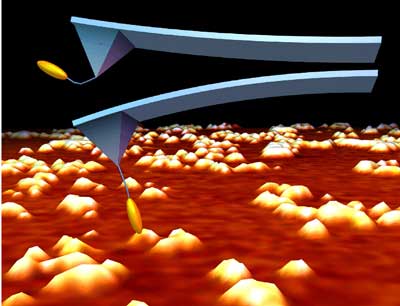 Das Rasterkraftmikroskop und das nahe verwandte Rastertunnelmikroskop gehören zu den faszinierendsten Erfindungen des ausgehenden letzten Jahrhunderts: Sie machten zum ersten Mal die Atome, also die Grundbausteine der Materie, sichtbar. Das „Sehen“ ist in diesem Zusammenhang allerdings nicht allzu wörtlich zu nehmen, denn das Bild entsteht auf indirekte Weise, die eher mit dem „Fühlen“ vergleichbar ist: Wie bei einem Nano-Plattenspieler fährt eine winzige Nadel über die Probenoberfläche. Vergleichbar dem Plattenspielerarm ist sie an einer äußerst empfindlichen Blattfeder aufgehängt. In einem definierten Raster tastet die Nadel Punkt für Punkt die Probe ab. Stößt das äußerste Atom der Nadelspitze dabei auf eine - ebenfalls atomare- Erhebung, wird es abgestoßen und die Spitze weicht minimal nach oben aus. In einem Tal sinkt sie nach unten. Die feine Ablenkung der Nadelspitze wird mit Lasern optisch registriert. So entsteht ein atomares Relief der Probenoberfläche.