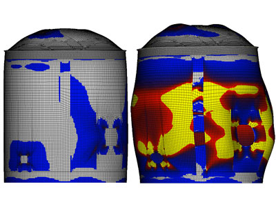 Die Ergebnisse der Innsbrucker Berechnung zeigen, dass unter dem Bemessungswert des Innendrucks nur geringe Schädigungen des Betons durch Rissbildung auftreten. Auch unter dem doppelten Wert des Bemessungsdrucks sind weite Bereiche des Behälters noch frei von Rissen, die geringe Schädigung hat sich im Wesentlichen nur in der Umgebung der Öffnungen ausgebreitet. Bei weiterer Steigerung des Innendrucks ist jedoch eine starke Ausbreitung der geschädigten Bereiche festzustellen, bis schließlich unter dem 2,9-fachen Wert des Bemessungsdrucks weite Teile des Behälters stark geschädigt sind und der Sicherheitsbehälter bei geringfügiger weiterer Steigerung der Belastung versagt. „Mit der Teilnahme an diesem Wettbewerb wollen wir zeigen, dass mit unseren Simulationsmodellen eine zutreffende Prognose des Tragverhaltens von Reaktorsicherheitsbehältern aus Spannbeton möglich ist. Außerdem erhalten wir dadurch Zugang zu den umfangreichen Messdaten, die eine wertvolle Grundlage für die Weiterentwicklung der numerischen Simulationsmodelle liefern", betont Prof. Hofstetter, der schon gespannt auf die Daten des Großversuches in Indien wartet.