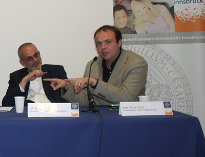 Vizerektor Dr. Martin Wieser (LFU), Mag. Markus Sommersacher (ORF), Mag. Frank Staud (TT), Markus Hatzer vom StudienVerlag Innsbruck-Wien-Bozen und Dr. Raffael Mooswalder von der Südtiroler Bauernjugend diskutierten in der abschließenden Podiumsdiskussion die Entwicklung der Massenmedien aus erster Hand und standen dem interessierten Publikum Rede und Antwort. Sommersacher gab einige Entwicklungstrends wieder: „Ich empfinde die Medienlandschaft hier in Tirol als einengend. Jede Vergrößerung der Produktpalette von Medienprodukten ist mir willkommen, vor allem, wenn sie qualitätsvoll ist.“ Frank Staud wollte dieser ersten Einschätzung nicht zustimmen: „Eine Dürre im Tiroler Printmedienbereich kann ich nicht erkennen, höchstens im elektronischen Bereich. Wir haben mit der Kronenzeitung den größten Herausforderer, den wir haben können. Außerdem gibt es den Kurier, die Presse, den Standard und die Salzburger Nachrichten, die alle ihre Korrespondenten hier in Innsbruck haben“.