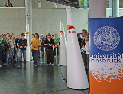 Bei dem Bewerb galt es, einen etwa 55 Meter langen Parcours durch den Ost-Gang des SoWi- Gebäudes mit superleichten ferngesteuerten Styroporflugzeugen - nicht größer als Papierflieger und von Red Bull zur Verfügung gestellt - zu bewältigen.
