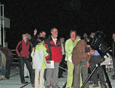 Am Abend, ab 21 Uhr, fanden sich dann auf der Beobachtungsplattform des Victor-Franz-Hess-Hauses in der Technikerstraße zirka 80 Personen ein, um bei bestem Wetter mittels zweier zu diesem Zweck aufgestellter kleiner Teleskope den Mond, die Planeten Venus und Saturn, sowie mehrere andere Himmelsobjekte zu bewundern und über diese näher informiert zu werden. Auch wurde das in der weißen Beobachtungskuppel untergebrachte 60cm-Ausbildungsteleskop des Instituts - mit dem auch bereits Daten für etliche wissenschaftliche Veröffentlichungen gewonnen werden konnten - vorgeführt. Neben Friedrich Vötter, der für das einwandfreie Funktionieren der Institutsteleskope verantwortlich ist, standen für die Beantwortung der zahlreichen Fragen der Besucher mit Stefanie Unterguggenberger, Emmerich Kneringer und Wolfgang Jais auch junge InstitutsmitarbeiterInnen zur Verfügung.
