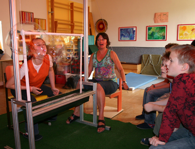 Eine Riesenseifenblase ist physikalisch leicht zu erklären. Laut Wikipedia ist die Erzeugung von Seifenblasen durch die Oberflächenspannung einer Flüssigkeit – in diesem Fall Wasser - möglich, die zu einem elastischen Verhalten der Oberfläche führt. Die Seife verkleinert die Oberflächenspannung und verlangsamt die Verdunstung, wodurch die Blasen entstehen und auch länger erhalten bleiben. Für Lisa ist die Herstellung einer Riesenseifenblase eine Herausforderung: Sie versucht richtig auszuatmen - nicht zu leicht und nicht zu fest. Man sieht ihr an, wie sie sich konzentriert. Groß ist die Freude, wenn es ihr gelingt, eine Regenbogenblase zu formen, manchmal purzeln auch kleine, schillernde Seifenkugeln unter den Bewunderungsrufen der anderen Kinder aus dem Rahmen. Lisa lacht und ist zufrieden. Lisa hat einen psycho-mentalen Entwicklungsrückstand erlitten, vermutlich als Folge traumatischer Kriegserlebnisse der Mutter während der Schwangerschaft in Bosnien.