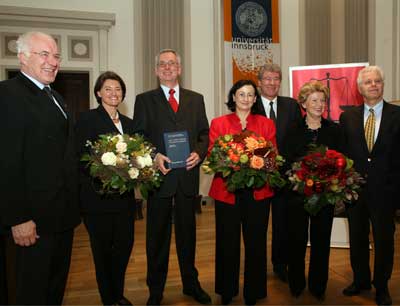 Prof. Dr. Norbert Wimmer hat im Laufe seiner bisherigen Tätigkeiten inner- und außerhalb der Universität gestaltende Funktionen übernommen. Dass er als Wissenschaftler, aktiver Jurist und Stadtpolitiker fachlich wie menschlich bleibende Spuren hinterlassen hat, verdeutlicht nicht nur die umfangreiche Festschrift, die ihm beim akademischen Festakt am 14. Dezember in der bestens gefüllten Aula der Universität überreicht wurde. Auch die zahlreich erschienenen, hochrangigen Gäste und Ansprachen von KollegInnen und Wegbegleitern brachten dies sehr deutlich zum Ausdruck. Neben Rektor Karlheinz Töchterle, der die Anwesenden im Namen der Universität feierlich begrüßte, waren die Altrektoren Ganter, Moser und Sprung anwesend, aber auch Bundesminister a.D. Prof. Hans Klesatzky war bei der Würdigung seines ehemaligen Schülers dabei.