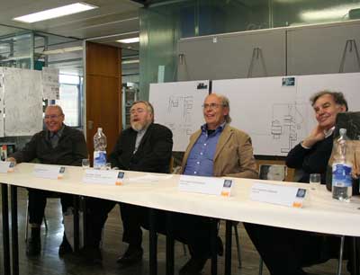 Friedrich Kurrent und Johann Georg Gsteu waren gemeinsam auf der Akademie der bildenden Künste bei Prof. Clemens Holzmeister. Hans Puchhammer, Sohn eines Baumeisters, studierte auf der technischen Hochschule in Wien. Der gut besuchte Vortrag im großen Hörsaal der Architekturfakultät wurde mit einer Lesung eines Textes von Friedrich Achleitner – der aus gesundheitlichen Gründen leider verhindert war - eröffnet.