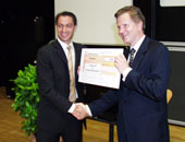 Nestlé-Generaldirektor Dr. Wolfgang H. Reichenberger gratuliert dem Preisträger Dr. Kourosh Bahrami.Gestern Abend konnte Nestlé-Generaldirektor Dr. Wolfgang H. Reichenberger dann den Sieger des diesjährigen Nestlé-Preises verkünden: Dr. Kourosh Bahrami von der Wirtschaftsuniversität Wien setzte sich am Ende gegen harte Konkurrenz aus ganz Österreich durch. Mit seiner Arbeit "Horizontale Transportlogistik - Kooperation als Synergiepotential für Hersteller kurzlebiger Konsumgüter" holte er sich das Preisgeld in der Höhe von SFr 10.000, das der Nestlé-Konzern alljährlich zur Verfügung stellt. Gleich hinter Bahrami landeten zwei Frauen: Dr. Evelyn Hayden von der Universität Wien mit der Dissertation "Modeling an Accounting-Based Rating System für Austrian Firms" und Mag. Dr. Doris Alexandra Weichselbaumer von der Universität Linz mit der Arbeit "Essays on Labor Market Discrimination". Für die Universität Innsbruck nahm Liechtensteinpreisträger Dr. Martin Kocher an der Ausscheidung teil. Die gestrenge Jury bestand aus den Dekanen aller wirtschaftswissenschaftlichen Fakultäten sowie aus Vertretern von Nestlé. Im Anschluss an die Preisverleihung wurden auch die Teilnehmer des Nestlé-Praxisseminars, die zum Thema "Turn shoppers into buyers" arbeiteten, noch ausgezeichnet.