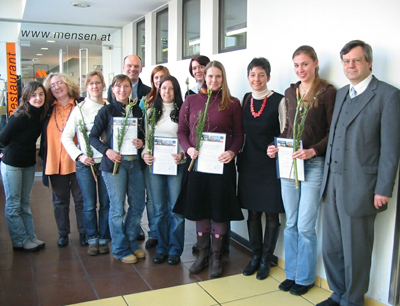 Anlässlich dieser Feier wurde den Studierenden und ihrer Kursleiterin Muryel Derlon mit Urkunden und Blumen gedankt. Als Gratulanten stellten sich die Leiterin des Frankreich-Schwerpunkts, Prof. Eva Lavric, der Leiter des Instituts für Translationswissenschaft, Prof. Wolfgang Pöckl, und der Leiter des MA Peace Studies, Prof. Wolfgang Dietrich ein.
