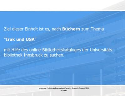 Das von der LFU Innsbruck geförderte eLearning-Projekt konzentriert sich auf zwei Schwerpunkte. Im Bereich wissenschaftliches Arbeiten soll den Studierenden mit Hilfe von Kurzfilmen gezeigt werden, wie Recherchen in Datenbanken der LFU Innsbruck, aber auch in Datenbanken im WWW am effizientesten durchgeführt werden. Die animierten Lerneinheiten dienen daher nicht nur Studierenden im Bereich IB, sondern sind generell für Studierende der Politikwissenschaft und unterschiedlicher Studienrichtungen geeignet. Da sich das eLearning-Projekt als ein Projekt „work in progress“ versteht, werden in diesem Bereich im Laufe der Zeit neue Lerneinheiten und Materialien zur Verfügung stehen. Damit will die ISRG einen Beitrag zur Beseitigung von Unsicherheiten auf dem Gebiet des wissenschaftlichen Arbeitens leisten.