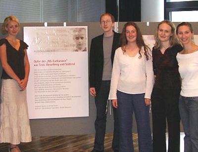 "Ausgelöscht. Opfer der NS-Euthanasie aus Tirol, Vorarlberg und Südtirol" war ursprünglich als der Beitrag des Instituts für Geschichte zu den Aktionstagen der "Jungen Uni 2004" gedacht. Daher richtet sich die Ausstellung vor allem an die 9 bis 14-jährigen SchülerInnen. Von Studierenden wurde versucht, das vielschichtige und sensible Thema der "NS-Euthanasie" verantwortungsvoll aufzubereiten und verständlich zu präsentieren. Eine eigene Webseite (www.zeitschatten.info) wurde mit dem Ziel erstellt, dass die Informationen von SchülerInnen gelesen und verstanden werden können. Auf dieser Webseite finden sich die Dokumentation zur Entstehung des Projektes, die Lebensgeschichten, Informationen zum historischen Hintergrund und ein Wörterbuch zu NS-Begriffen sowie ein Pressespiegel.