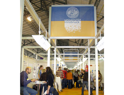 Am großen Ausstellerstand der LFU Innsbruck, der auf der Messe auch „Uni-Straße“ oder „Uni-City“ genannt wurde, waren alle Fakultäten vertreten. Man konnte sich ungestört vom Stand der Architektur, der Bauingenieurwissenschaften, der Betriebswirtschaft, der Bildungswissenschaften, der Biologie, der Chemie und Pharmazie über die Fakultät der Geo- und Atmosphärenwissenschaften, der Katholisch-Theologischen Fakultät, der Mathematik, Informatik, Physik, der Philosophisch-Historischen Fakultät, der Philologisch -Kulturwissenschaftlichen Fakultät, der Politikwissenschaft und Soziologie, der Fakultät für Psychologie und Sportwissenschaften, der Rechtswissenschaftlichen Fakultät bis hin zur Volkswirtschaft und Statistik vorarbeiten. Von StudentInnen der jeweiligen Fächer, über DoktorandInnen bis hin zu DekanInnen, FakultätsstudienleiterInnen und UniversitätsprofessorInnen waren alle vertreten. Interessierte konnte sich informieren und bekamen ehrliche und nützliche Antworten. Auch das Büro für Internationale Beziehungen und die Behindertenbeauftragte der LFU Innsbruck waren auf der Messe anzutreffen. Die Studien- und MaturantInnenberatung und die Studienabteilung rundeten das Informationsangebot der LFU ab.