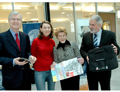 LR Koler und Bgm. Zach begrüßten die junge Studierende der Internationalen Wirtschaftswissenschaften aus Innsbruck. Koler betonte, die Unverzichtbarkeit der beiden Innsbrucker Universitäten für das Land Tirol. Zach hob besonders die Angebote der Stadt im Bereich der Mietzinsbeihilfe, das IVB-Semesterticket und die zahlreichen Ermäßigungen bei den Kultureinrichtungen hervor. Rektor Gantner zeigte sich von allen drei Produkten überzeugt: „Die Laptop-Tasche ist ein Symbol für die Modernisierung unserer Universität und steht für mich für die erfolgreichste Innovation unseres Lehrangebots, unserem Informatik-Studium. Zudem hat sie für unsere Studierenden einen hohen Gebrauchswert. Der Stadtplan belegt eindrucksvoll, dass Orientierungswissen nicht nur für die Ausbildung wichtig ist und das Gutscheinheft beinhaltet viele Eintrittskarten zum Kennenlernen der Universitätsstadt Innsbruck.“