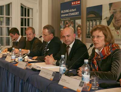 Rund 150 Interessierte verfolgten die Diskussion von Vizerektorin Margret Friedrich, Robert Mäser (Vorsitzender der ÖH Innsbruck), Norbert Mühlburger (Geschäftsführer der Westcam Gruppe), Dietmar Strigl (Personalchef der BTV Tirol ) und Alexander Hofmann (Wirtschaftskammer Österreich) über die neue Studienarchitektur und deren Auswirkungen auf den Arbeitsmarkt. Die DiskutantInnen waren sich darin einig, dass die Bachelorstudien ein neues Segment von hoch qualifizierten HochschulabsolventInnen eröffnen, die zukünftig den Arbeitsmarkt wesentlich mitgestalten werden.