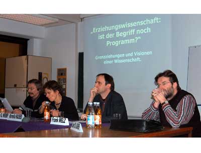 Im Anschluss an die Eingangsreferate fand eine Diskussion statt, die von zwei Studierenden geleitet wurde. Sie verlief anfangs etwas zögerlich, wurde aber im Laufe des Abends immer lebhafter. Die zentralen Fragen waren: Sind der Bildungsbegriff und der Erziehungsbegriff trennbar? Steht die Erziehungswissenschaft mit einem Bein in der Soziologie und mit dem anderen Bein in der Psychologie? Hat sie nur eine Vermittlerfunktion zwischen den Wissenschaften und kein eigenes Standbein? Wie lassen sich Theorie und Praxis verknüpfen?