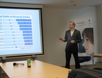 Robin Hengl berichtete über die Erfahrungen seiner IT-Firma, e-seal, mit diesem Thema: e-seal ist seit Ende der 90er Jahre im Bereich der Softwareentwicklung tätig und auf Business Anwendungen spezialisiert. Anfangs mitgerissen vom IT-Boom, bekam das Unternehmen aber die nach und nach einsetzende Flaute zu spüren. Die zusätzlich aufkommende Konkurrenz aus osteuropäischen Ländern wie Tschechien und Rumänien – deren Angebote aufgrund des niedrigen Lohnniveaus kaum zu unterbieten waren – bewegten dazu, Teile der Programmierung auszulagern.