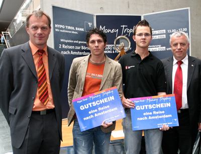 Als Preise winkten zwei Reisen zum Finanzplatz Amsterdam, sowie weitere attraktive Buchpreise. Das beste Ergebnis der Money Trophy 2006 erzielte Jörg Bayer, BWL-Student im vierten Semester, der damit als erster Gewinner der Reise feststand. Die zweite Reise wurde bei der offiziellen Prämierung am 1. Juni unter den besten 30 Prozent aller TeilnehmerInnen verlost. Dabei fiel das Los auf Hubert Oberhuber, IWW-Student im vierten Semester. Die Preise wurden von Werner Pfeifer, Direktor der Hypo Tirol Bank AG, übergeben. Außerdem gratulierten auch der Dekan der Fakultät für Betriebswirtschaft Prof. Stephan Laske und Prof. Matthias Bank.
