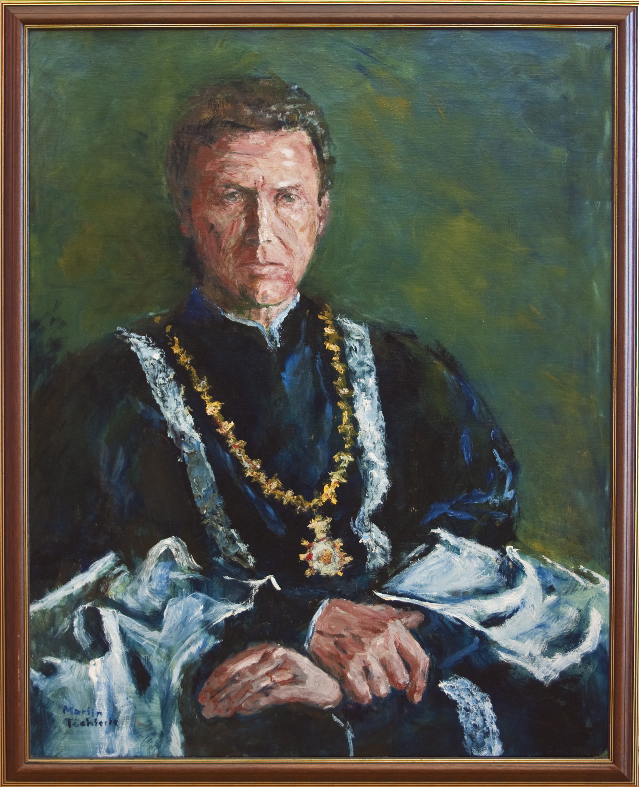 Martin Töchterle malt seit über 25 Jahren Aquarelle und Ölbilder, seit einiger Zeit experimentiert er auch mit Mischtechniken. Sein thematisches Interesse ist breit gefächert und reicht von Landschaften über Stillleben und Akte bis hin zu Porträts. Seit sechs Jahren widmet er sich besonders intensiv der Malerei. Das Porträt seines Bruders Karlheinz hat er als 100 mal 80 Zentimeter großes Öl-auf-Leinwand-Gemälde konzipiert. „Es war mir ein großes Anliegen, dem Charakter von Karlheinz möglichst gut zu entsprechen“, sagt Martin Töchterle. „Ihm sind Traditionen sehr wichtig, aus diesem Grund ist das Bild eher klassisch“, erläutert er weiter. Es ehre ihn sehr, dass sein Werk in einer Reihe mit so vielen großen Tiroler Künstlern hängen werde, so Martin Töchterle.
