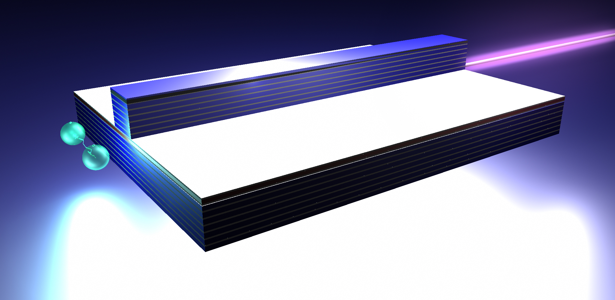 Gallium-Arsenid ist ein gängiges Material für den Bau von Laserdioden. Es verfügt über die von Quantenoptikern geschätzten nichtlinearen Eigenschaften, die vielfältige physikalische Phänomene technologisch nutzbar machen. So lassen sich in dem Material auch Photonen aus einem Laser in Photonenpaare niedrigerer Energie aufspalten. Diese in einem Halbleiter generierten Photonenpaare sind verschränkt, haben also einen Quantenzustand gemeinsam. Für die praktische Nutzung der Verschränkung für die Informationsverarbeitung stellt sich aber ein Problem. „Weil sich die Photonen des Lasers und die Photonenpaare mit unterschiedlicher Geschwindigkeit durch das transparente Material fortbewegen, löschen sie sich meist gegenseitig aus“, erklärt Gregor Weihs. „Die Ausbeute an Photonenpaaren ist deshalb äußerst gering.“ Der Idee von Forscherkollegen der Universität Toronto folgend, haben Weihs und sein Team den Halbleiterchip deshalb wie einen Schichtkuchen aufgebaut. Die einzelnen Schichten haben unterschiedliche Brechungsindizes, und ihre Dicke liegt im Nanometerbereich. An den Schichtgrenzen kommt es zu Lichtreflexionen, die - richtig eingesetzt - die Photonen in gleicher Geschwindigkeit durch das Material leiten und so die gegenseitige Auslöschung verhindern. Damit steigt die Effizienz der Photonenquelle stark an.