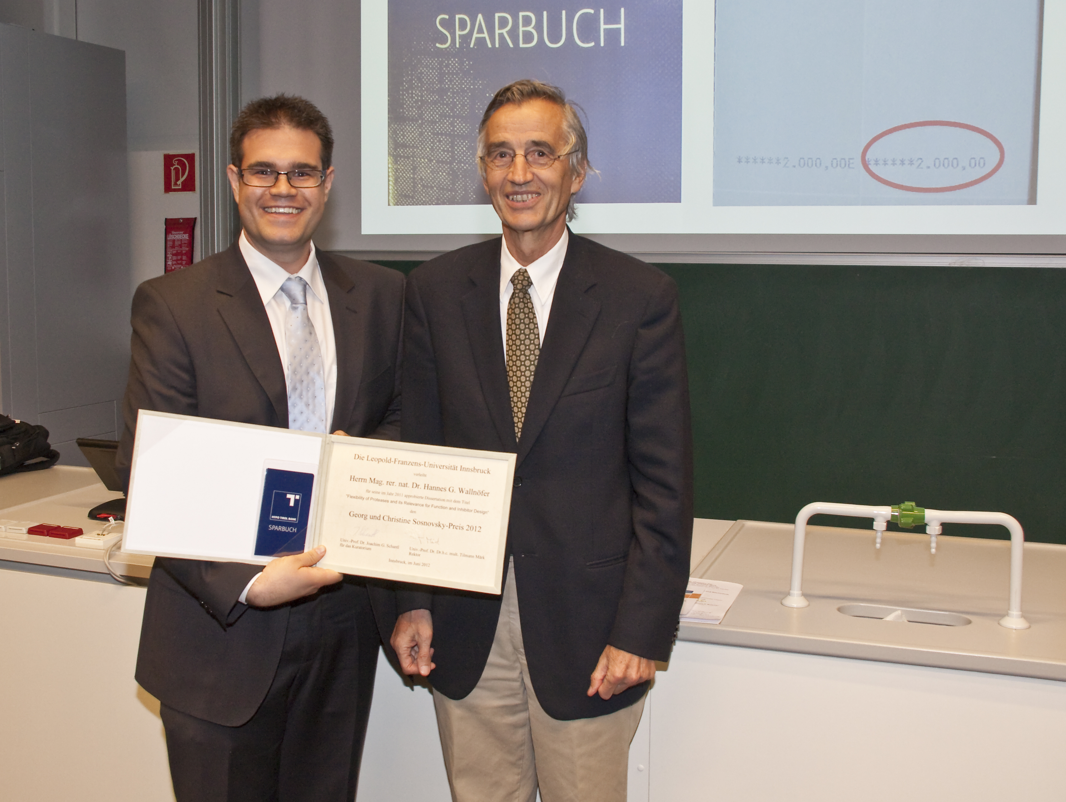 Rektor Tilmann Märk überreichte die Auszeichnung im Beisein vom Prof. Joachim Schantl, dem Koordinator des Preises. Im Anschluss an die Verleihung präsentierte Hannes Wallnöfer seine Arbeit, die er bei Boehringer Ingelheim Pharma GmbH & Co. KG und in der Arbeitsgruppe von Prof. DDr. Klaus R. Liedl am Institut für Allgemeine, Anorganische und Theoretische Chemie der Uni Innsbruck verfasst hat.