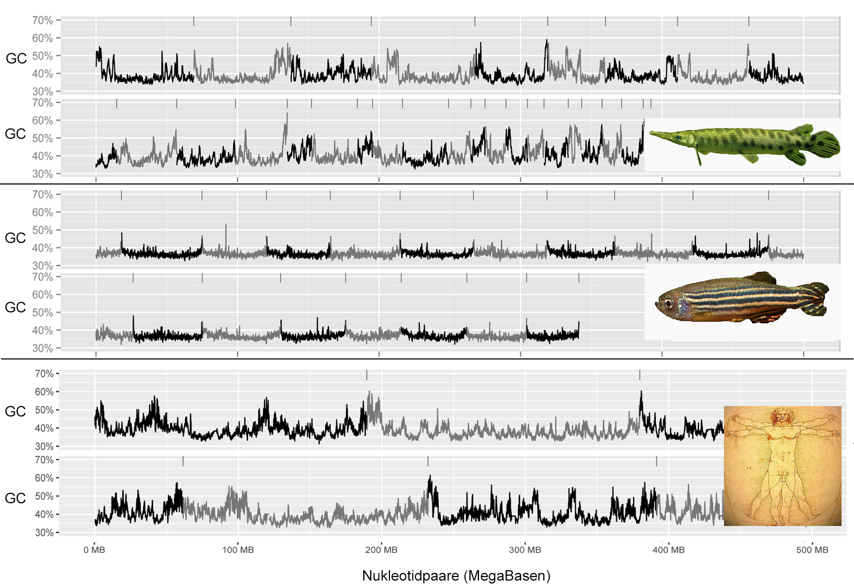 Die Nukleotide A, T, C und G sind die Grundbausteine der DNA, also der Erbsubstanz in der Zelle. Die Abfolge dieser genetischen Bausteine hat neben der Protein-Codierung zahlreiche entscheidende, zellregulatorische Funktionen. Mit ihrem internationalen Forscherteam hat Radka Symonova durch die zytogenomische Analyse zweier Knochenhechtgattungen (Atractosteus und Lepisosteus) erstmals bemerkt, dass der Anteil von G und C auf deren Chromosomen für Fische äußerst ungewöhnlich ist: Bei den Knochenhechten konnte damit erstmals eine GC-Kompartimentierung bei Fischen nachgewiesen werden. Die Folgerung daraus überraschte selbst die Wissenschaftler: „Unsere Ergebnisse lassen den Schluss zu, dass die Genomorganisation der Knochenhechte mehr Ähnlichkeit zu den Säugetieren als zu anderen Fischen hat. Wir nehmen an, dass der Knochenhecht eine konvergente Evolution zu den tetrapoden Lebewesen durchlaufen hat, das heißt, dass er sich parallel zu jenen Organismen entwickelt hat, von denen in weiterer Folge die Säugetiere abstammen“, sagt Radka Symonova. „Diese Erkenntnis wirft ein ganz neues Licht auf die Genomevolution der Wirbeltiere und fordert jetzt eine große Revision der bisherigen Hypothesen, Daten und auch Herangehensweisen.“