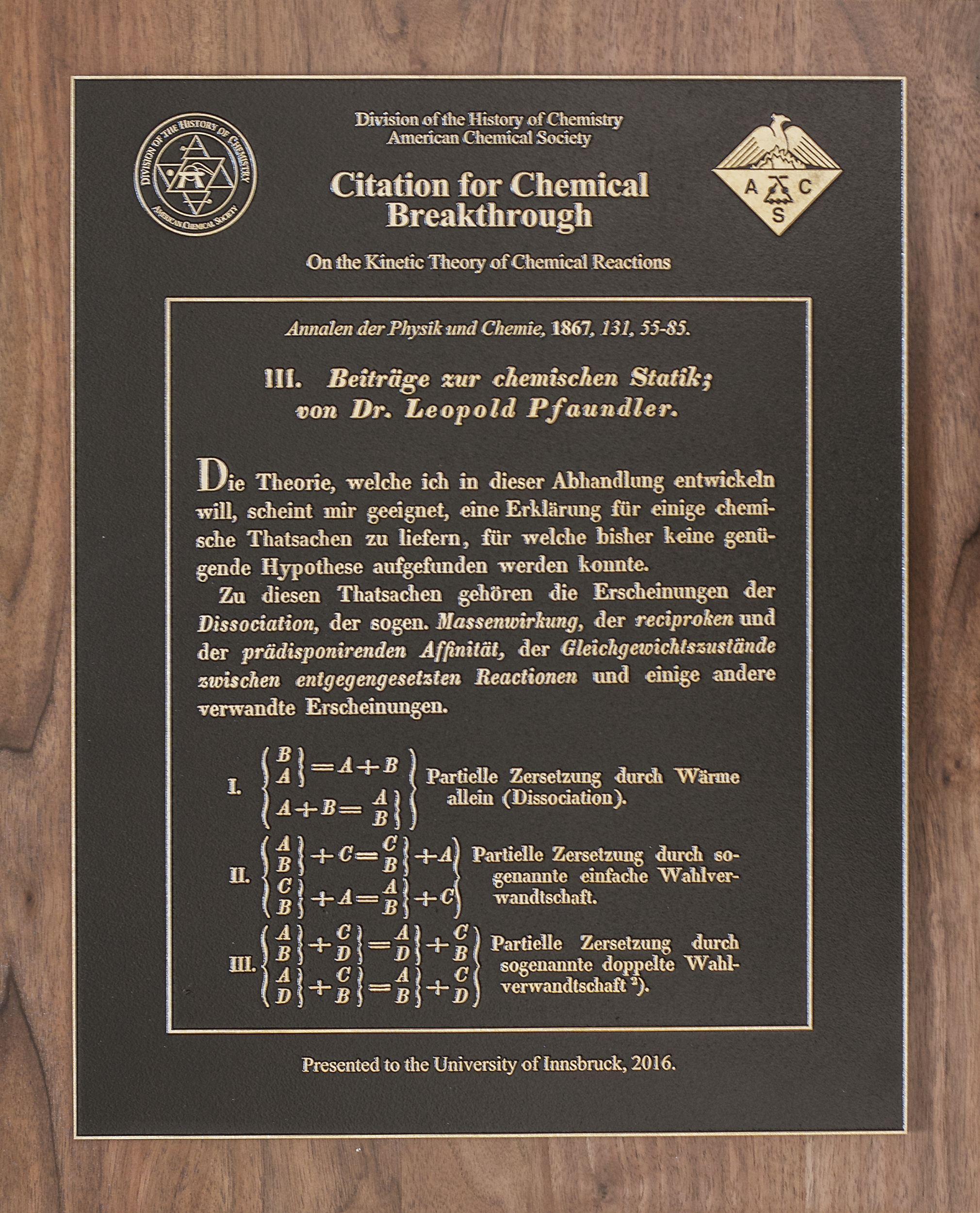 Im Rahmen eines Symposiums zu Ehren von Leopold Pfaundler übergab am Montag Prof. Guillermo Restrepo im Namen der Division of the History of Chemistry of the American Chemical Society eine Gedenkplakette an den Rektor der Universität Innsbruck, mit der eine Arbeit Leopold Pfaundlers aus dem Jahr 1867 gewürdigt wird, in der sich der Physiker mit der damals noch ungelösten Frage auseinandersetzt, warum an sich von selbst stattfindende Reaktionen zum Stillstand kommen, bevor sie vollständig abgelaufen sind. Solche Vorgänge können zum Beispiel Verdampfung, Dissoziation von Molekülen oder andere chemische Prozesse sein. In der Regel bleiben diese in einem Gleichgewicht stehen, bei dem sowohl das Reaktionsprodukt als auch die Ausgangssubstanz noch in einem bestimmten Verhältnis vorhanden sind. Warum kommt es zu diesem Stillstand? Pfaundler zeigt in seiner Arbeit, dass es sich nur scheinbar um einen Stillstand handelt, dass in Wirklichkeit die Reaktion weiterhin abläuft, aber gleichzeitig durch eine Rückreaktion aufgehoben wird. Es handelt sich also um ein dynamisches Gleichgewicht. Erst über diese Einsicht wird es möglich, auf die einzelnen Prozesse gezielt Einfluss zu nehmen und die Reaktionen in eine gewünschte Richtung zu steuern sowie ihre Ausbeute zu optimieren. Praktisch alle modernen industriellen chemischen Prozesse beruhen letztlich auf dieser Einsicht Pfaundlers in die dynamische Natur des chemischen Gleichgewichtes.