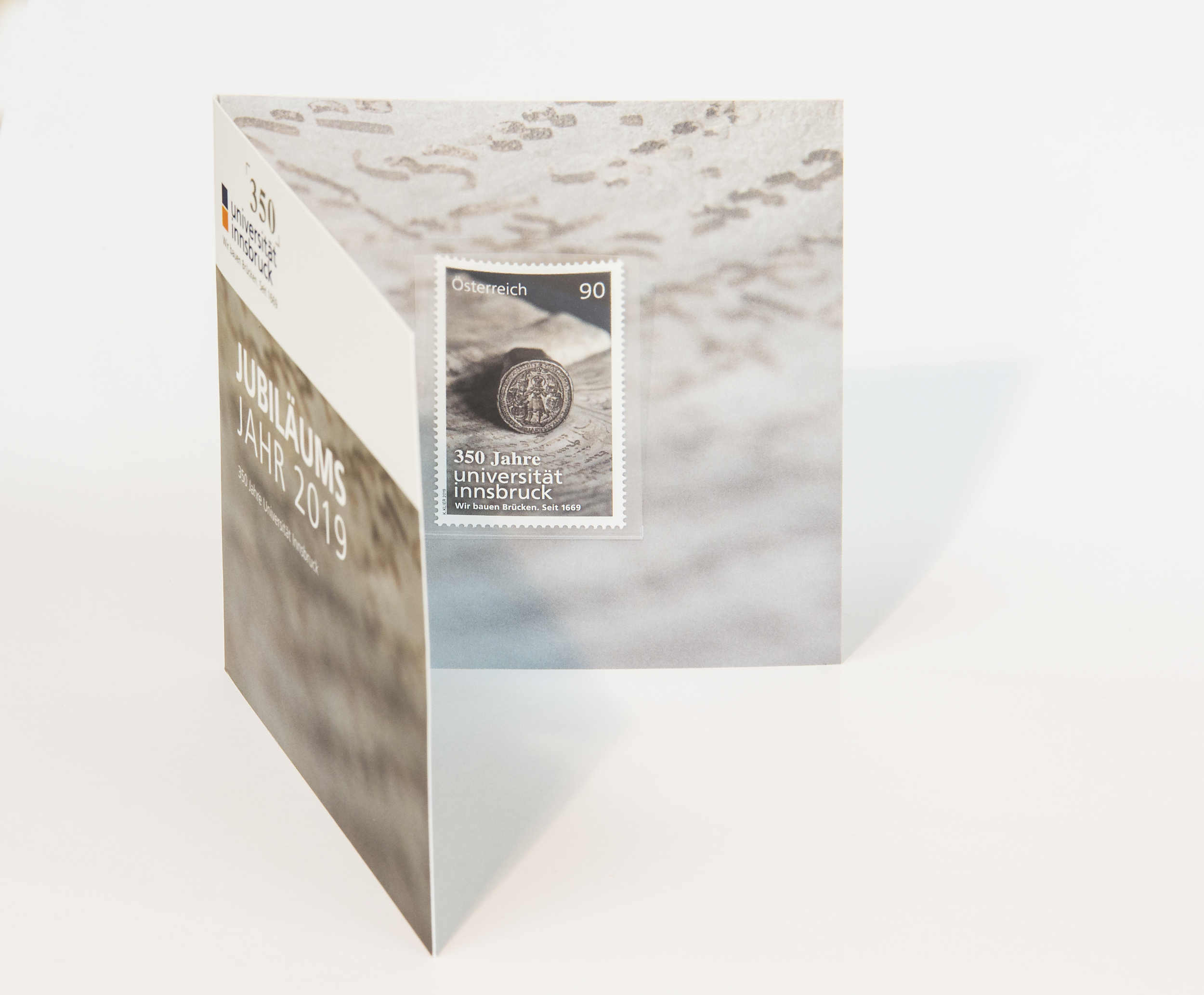 Mit Einführung des Haller Salzaufschlags durch Kaiser Leopold I. am 15. Oktober 1669 wurde die Universität Innsbruck gegründet. Ein Ereignis, das die Universität Innsbruck dieses Jahr mit Ausstellungen, Konzerten, Vorträgen und großen Festen ausgiebig feiert und das die Österreichische Post AG genutzt hat, gemeinsam mit der Universität eine Jubiläums-Briefmarke zu gestalten. Die Sondermarke zeigt das historische Siegel der Universität auf der Gründungsurkunde und erinnert damit an den 15. Oktober 1669. Sie wird erstmals bei einem Sonderpostamt am 25. Jänner 2019 erhältlich sein, erscheint in einer Auflage von 185.000 Stück und trägt den Wert von 90 Cent – die erste Post-Tarifstufe für Sendungen ins Ausland. „Es freut mich sehr, dass die Post unser Universitätsjubiläum dieses Jahr für eine ihrer Sondermarken ausgewählt hat. Mit dieser Sondermarke zu 90 Cent können auch Briefe ins europäische Ausland frankiert werden – damit tragen wir das 350-Jahr-Jubiläum der Universität Innsbruck buchstäblich in die Welt hinaus“, sagt Rektor Tilmann Märk.
