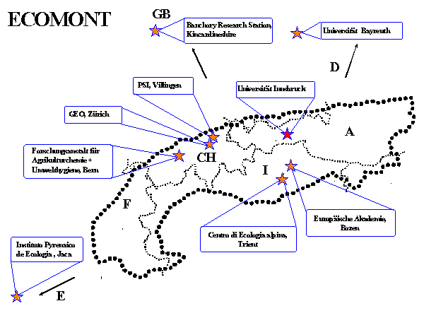 The project will be coordinated by the Project Coordinator Univ.-Prof. Dr. A. Cernusca, Institute of Botany, University of Innsbruck.8 institutions (Partner Teams) will contribute to ECOMONT: