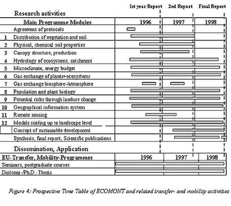 Most elements of the study will be undertaken throughout the three year period. Exceptions are the remote sensing work, the gas exchange, canopy structure analyses and comparative work. The investigation of gas exchanges between the composite experimental sites and the atmosphere (use of the aircraft, the eddy correlation method in forests and the setup of 4 SCIDAR/DOAS combinations surrounding the study sites) will be restricted to some episodic events during July and August of 1996, 1997. The soil descriptive work will begin in 1996 and be completed in 1997. An essential part of the project are the modelling activities which will take place in parallel to the field work. In this way a combination of field measurements and mathematical modelling will ensure an efficient integrated ecosystem research. The interdependence of tasks, as being assembled to work packages, will be as indicated in 3. (Project Methodology). Reporting will occur each year (spring) in the form of formal reports and a workshop for all the ECOMONT contributors. In order to ensure an efficient dissemination and application of the results of ECOMONT transfer- and mobility-programme of the EU will be used.