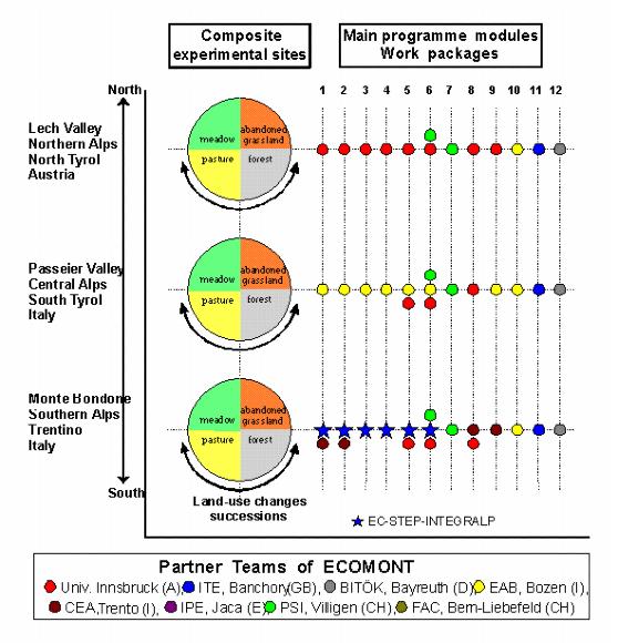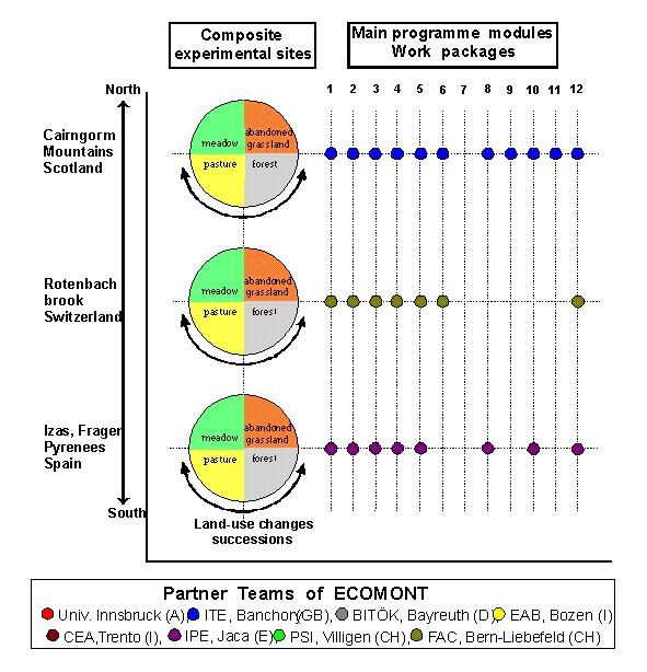 In each site of ECOMONT comparative and complementary multidisciplinary integrated ecosystem studies will be conducted on differently managed ecosystems (meadows, pastures, abandoned areas, dwarf shrub communities and forests). Figures 2a and 2b show the conceptual scheme of the research project ECOMONT, indicating the 6 different sites along the two European transects, the 12 work packages carried out in composite experimental sites and the contributing 8 partner teams. The following research topics, will be investigated: