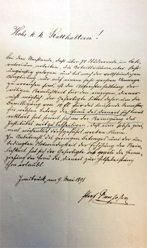 Bei dem Umstande, daß über 70 Studierende im Laboratorium arbeiten, die Arbeitsräume aber sehr ungünstig gelegen und bis nach der vollständigen Adaptierung nur auf einem sehr großen Umwege zu erreichen sind, ist die Aufrechterhaltung der nötigen Reinlichkeit für den einzigen Diener nicht möglich. Der Gefertigte bittet daher um die Bewilligung von 10 fl für das laufende Semester für welchen Betrag die Frau des Dieners sich bereit erklärt hat, soweit sich an der Reinigung des Institutes mit zu betheiligen, daß eine solche zweimal wöchentlich durchgeführt werden kann.