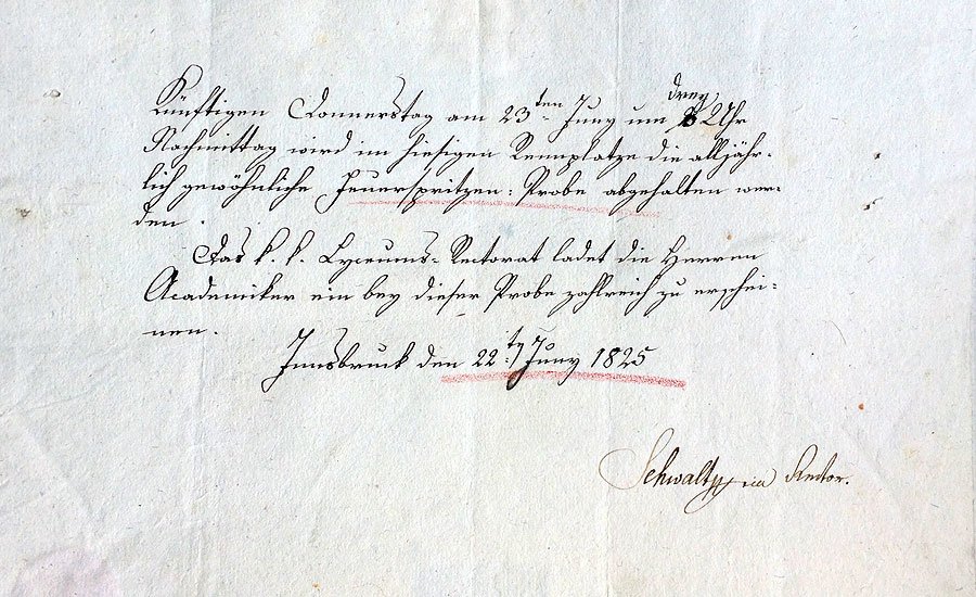 Ankündigung am Schwarzen Brett, Universitätsarchiv Innsbruck, Akten des Rektorats, 83/R, 1824/25.