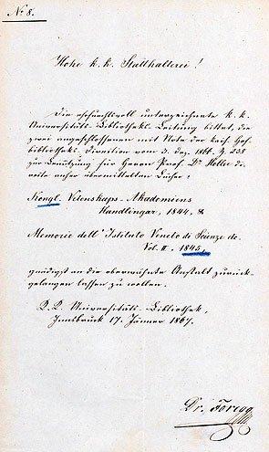 Die ehrfurchtsvoll unterzeichnete k.k. Universitäts-Bibliotheks-Leitung bittet, die zwei angeschlossenen mit Note der kais. Hofbibliotheks-Direction vom 3. Dez. 1866 Z. 328 zur Benützung für Herrn Prof. Dr. Heller directe anher übermittelten Bücher: