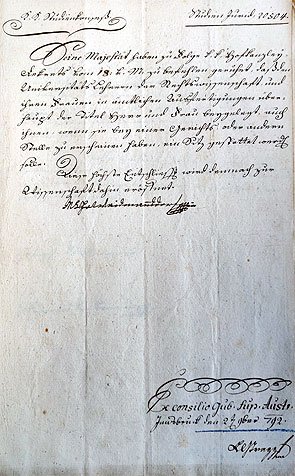 Es bringe die von selbem allunterthänigst angesuchte, und Mittels k.k. HofKanzley Dekrets vom 2ten erdeudten WeinMonats allergnädigst zu gestandenen Ammts Jubilation ohnehin mit sich, das selber zwar gleich anderen Jubilirten Beamten aller seiner Privilegien, und Vorzüge die jedem Universitäts Mitgliede, um so mehr einem nach erworbenen vielen Verdiensten in den Ruhestand gesezten Lehrer zu statten kommen, folglich auch der Universitäts Gerichtsbarkeit weitershin zu geniesen habe, und werde auch kein Anstand genommen, dessen Namen unter dem Titel: Jubilirter Lehrer der mathematischen Wissenschaften, und würklicher Aufseher über das Vorder österreichische Mappirungs Geschäft dem gedruckten Schematismus am betrefenden Orte einrücken zu lassen.