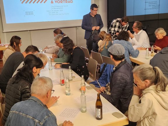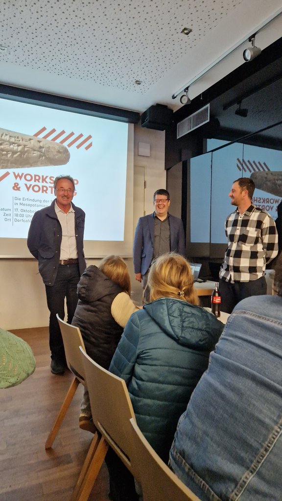 Auf Einladung des Ausschusses des Museumvereins Fließ hielt Priv. Doz. Dr. Sebastian Fink am 17. Oktober 2025 im Via-Claudia-Saal einen Vortrag und Workshop über Keilschrift. Die Veranstaltung dauerte von 18:00 bis 19:30. Das besondere an diesem Vortrag war, dass er für ein sehr breites Publikum bzw. für Interessierte auch ohne höheren Bildungsanschluss gestaltet wurde, z.B. Kinder aus Mittelschulen oder Erwerbstätige in allen möglichen Sparten. Daher wurde dieser Vortrag auch gezielt über die Schulen/bei den Schüler*innen und Eltern beworben.
