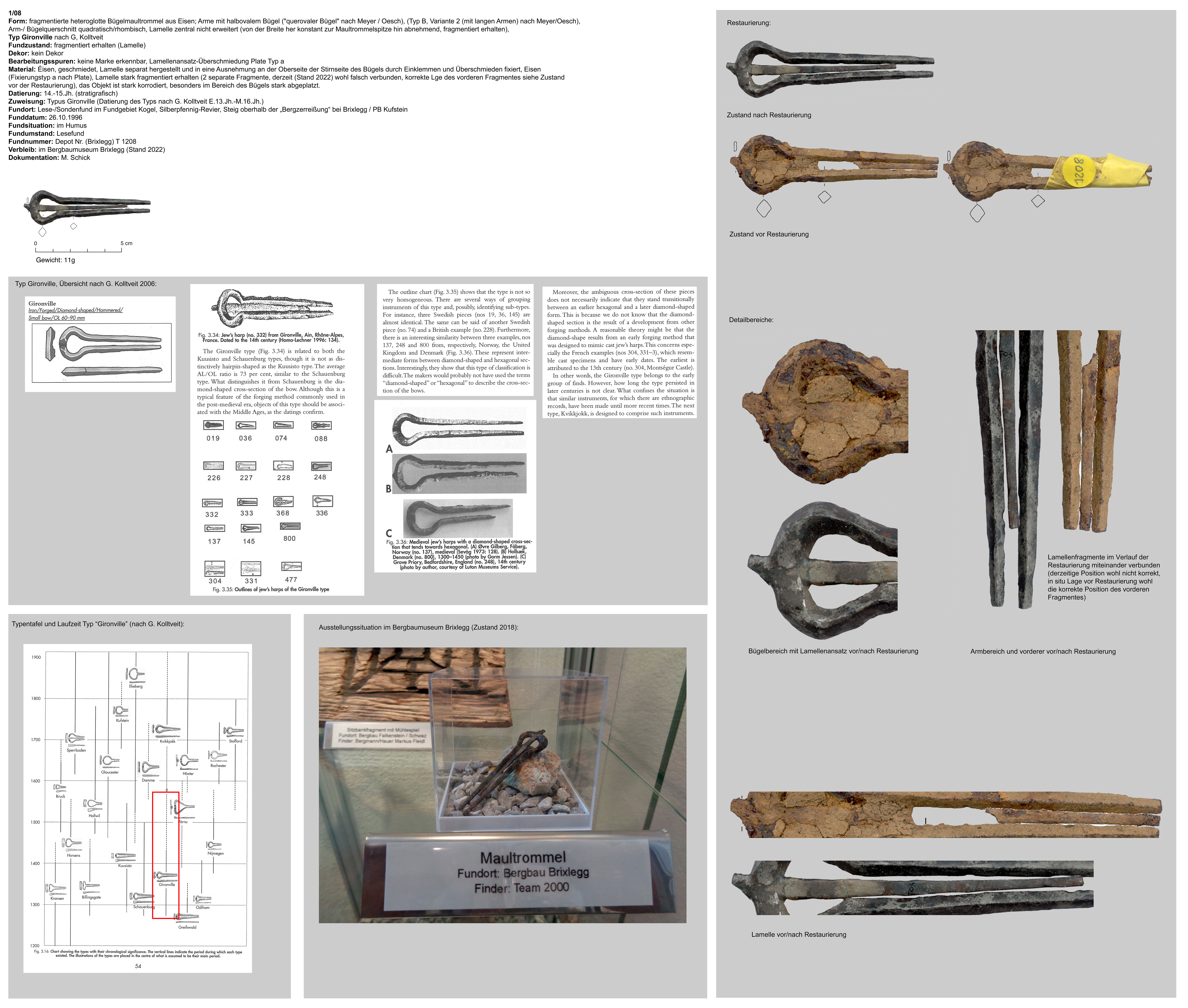 | 1/08 | halbrund aus-geformter Bügel, Arm- und Bügel-querschnitt quadratisch, geschmiedet | Lamelle nur partiell erhalten, separat geschmiedet, an der Oberseite des Bügels durch Einklemmen fixiert (Typ a nach Plate) | Typus | Brixlegg | Bergbaurevier, Lesefund | keine |