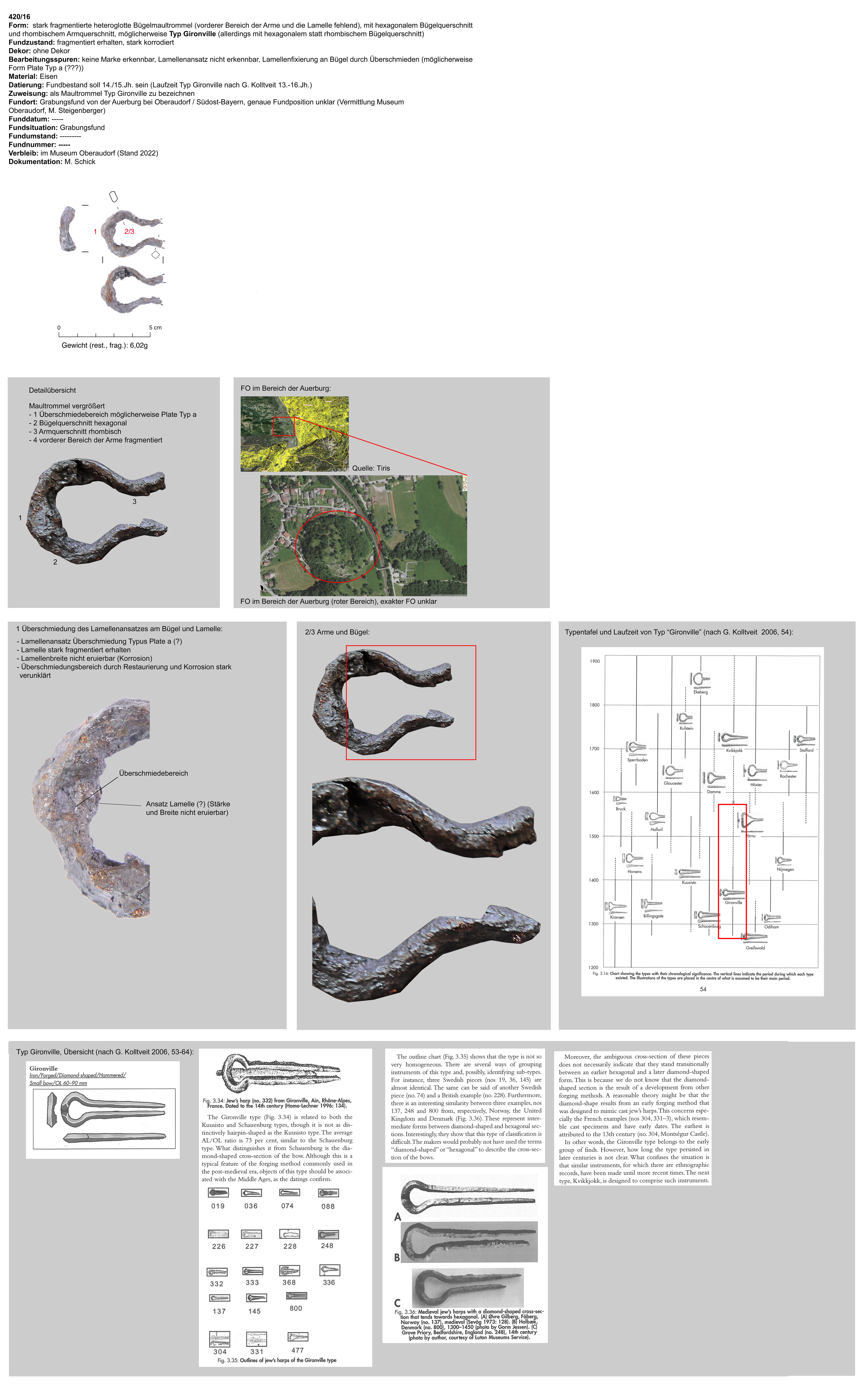 | 961/19 | halbrund aus-geformter Bügel, Arm- und Bügel-querschnitt quadratisch, geschmiedet | Lamelle nur partiell erhalten, separat geschmiedet, an der Oberseite des Bügels durch Einklemmen fixiert (Typ a nach Plate) | 14./15.Jh | Auerburg, Oberaudorf (D) | Burgareal | keine |