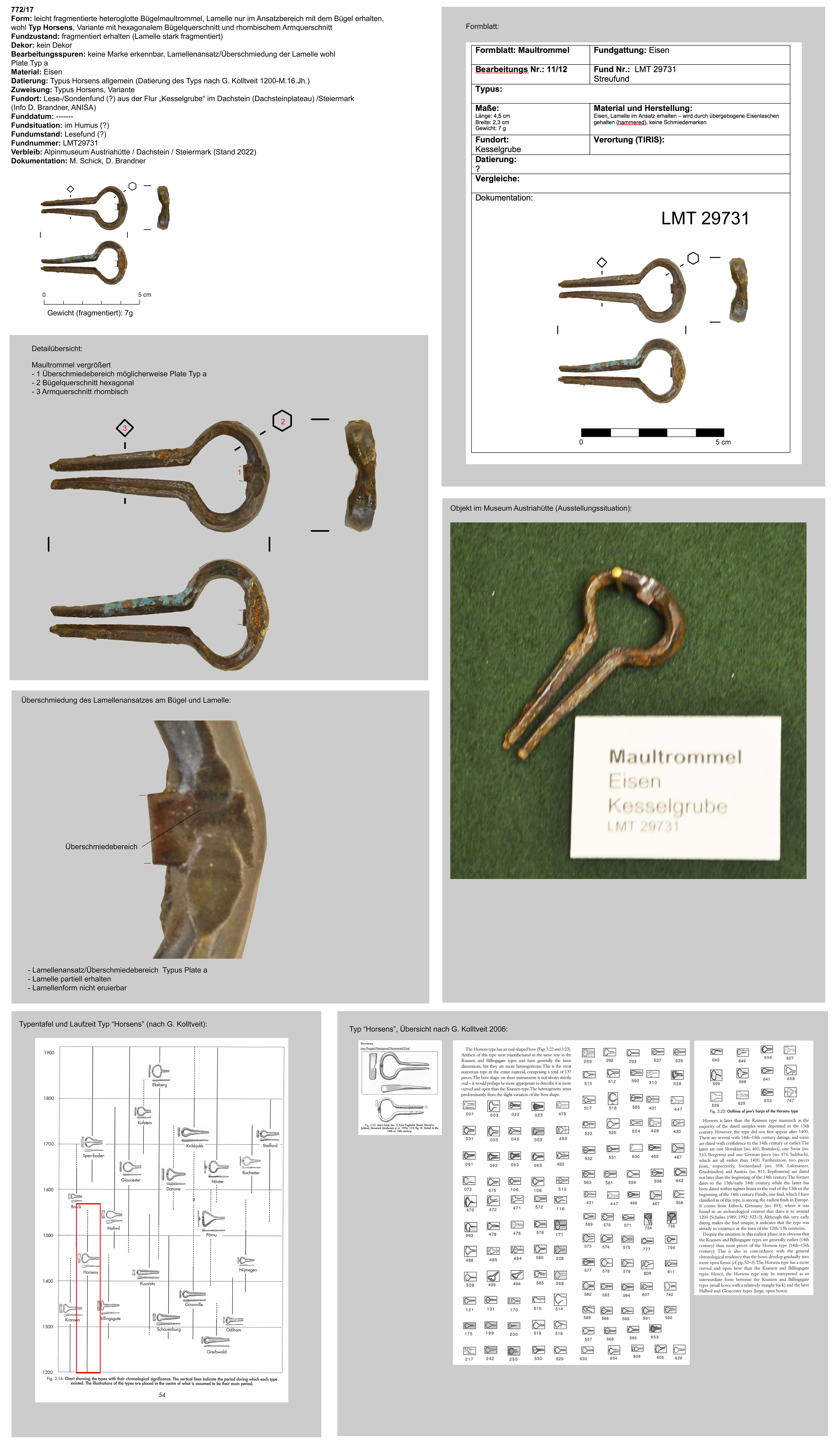 | 33/08 | Langgezogen oval ausgeformter Bügel, Armquerschnitt quadratisch, Bügelquerschnitt hexagonal, geschmiedet | Lamelle nur partiell erhalten, separat geschmiedet, an der Oberseite des Bügels durch Einklemmenfixiert (Typ a nach Plate) | 1200-16.Jh. | Schrofenstein, Landeck | Weideland, Lesefund | Bügelaussenseite, "pickelartig" |