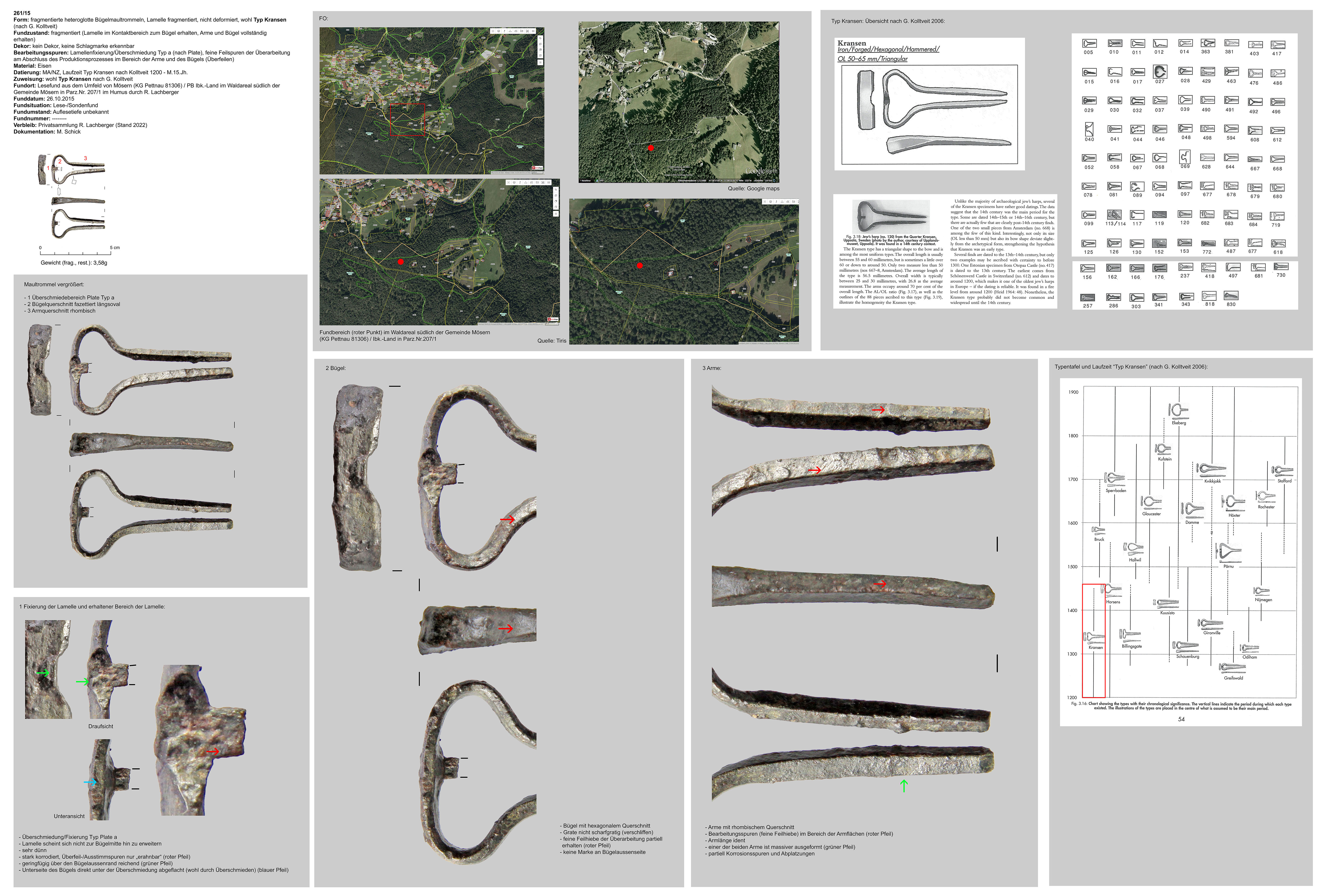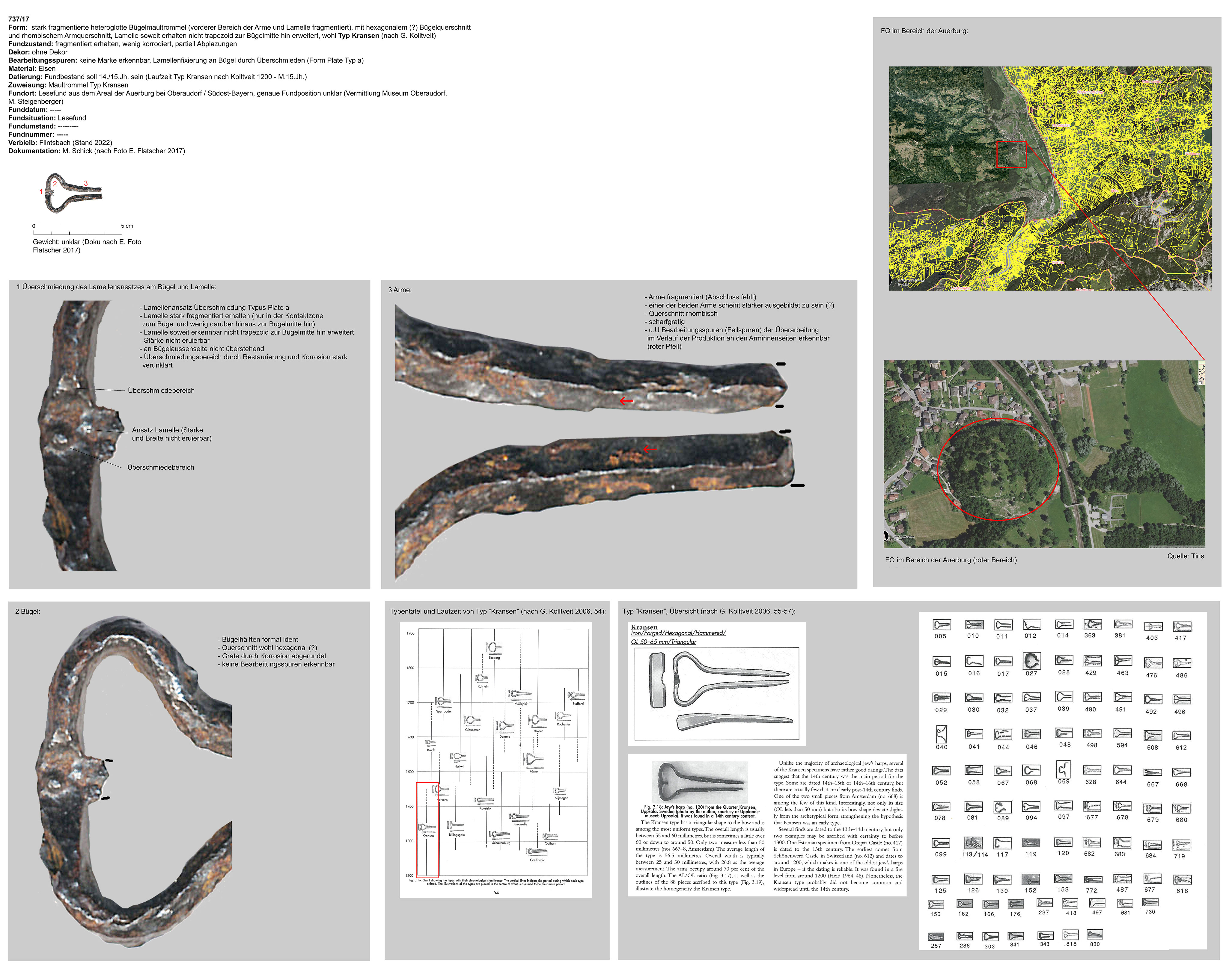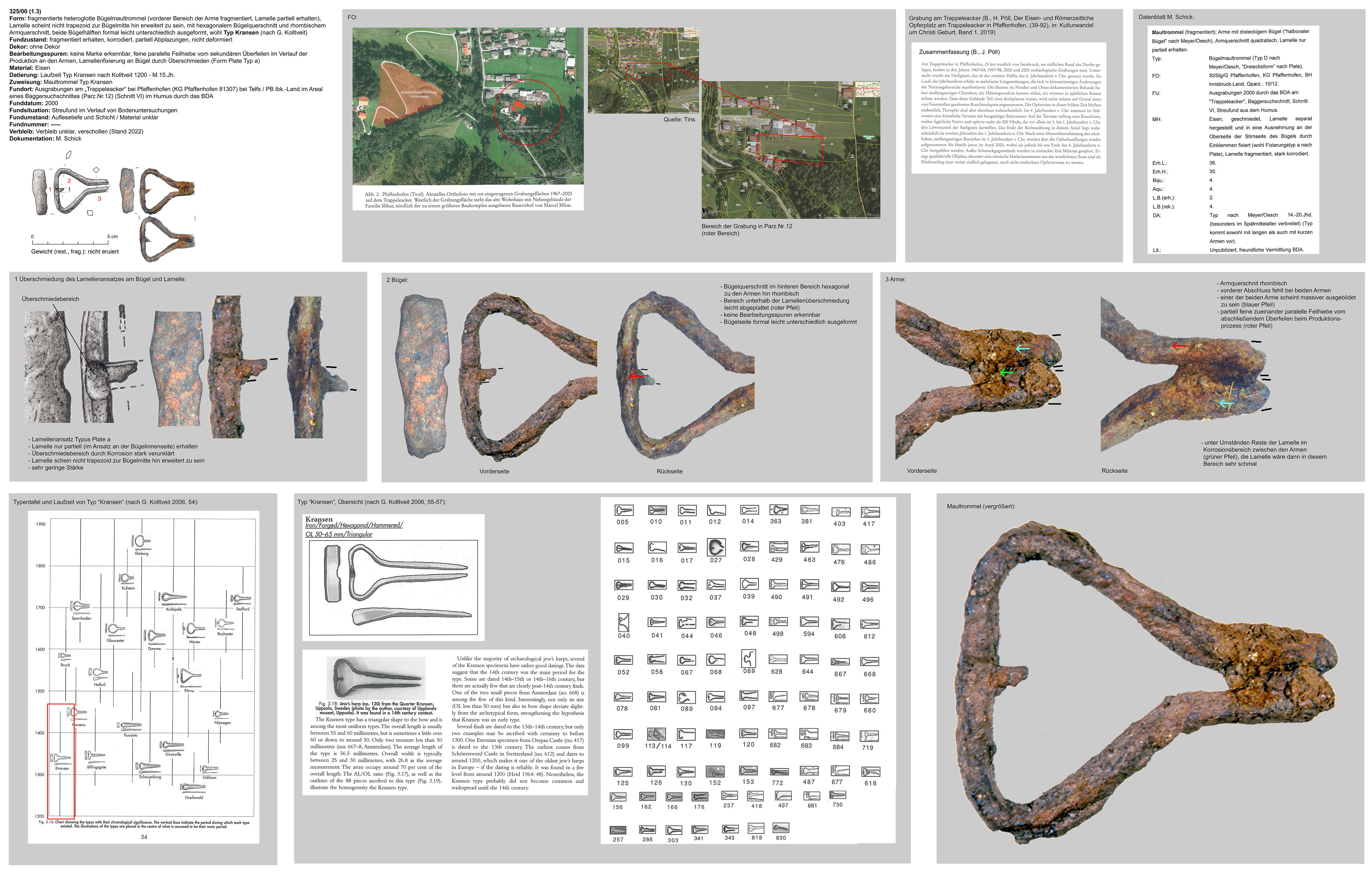 | 128/12 | Dreieckig oval ausgeformter Bügel, Armquerschnitt quadratisch, Bügelquerschnitt hexagonal, geschmiedet | Lamelle partiell erhalten, separat geschmiedet, an der Oberseite des Bügels durch Einklemmen fixiert (Typ a nach Plate) | vor 1504 | Burg Rotund, Taufers (I) | Burgareal, Grabungsfund | ohne |