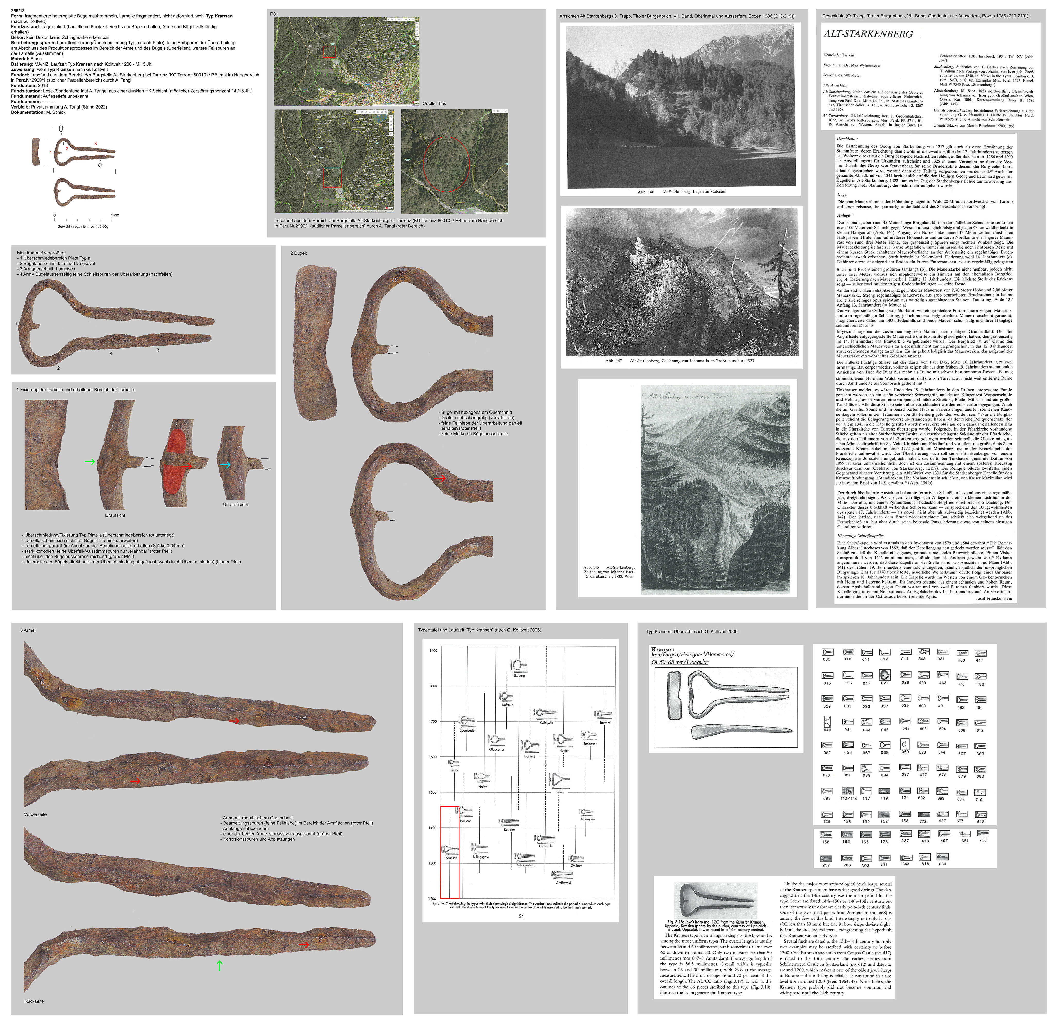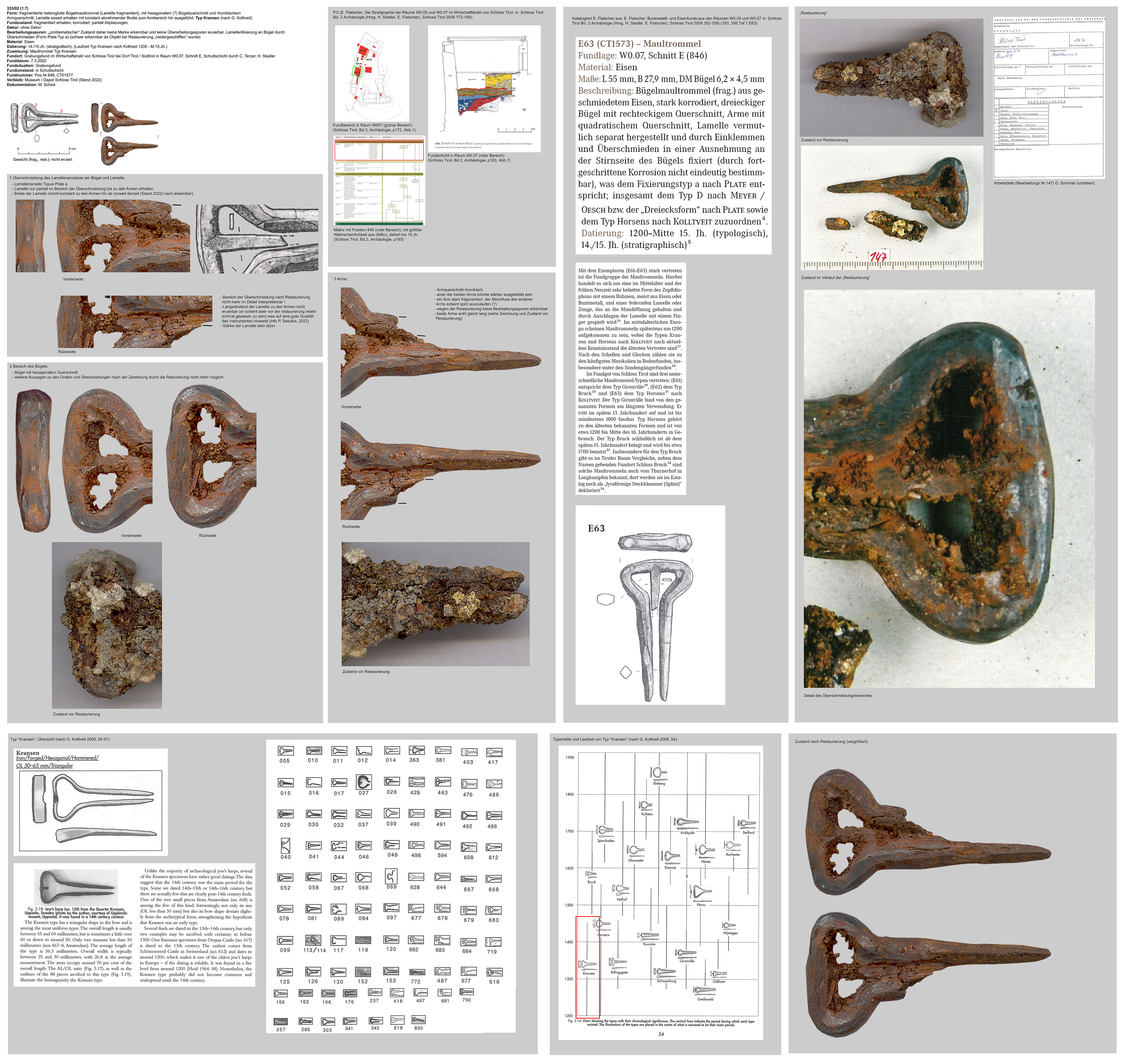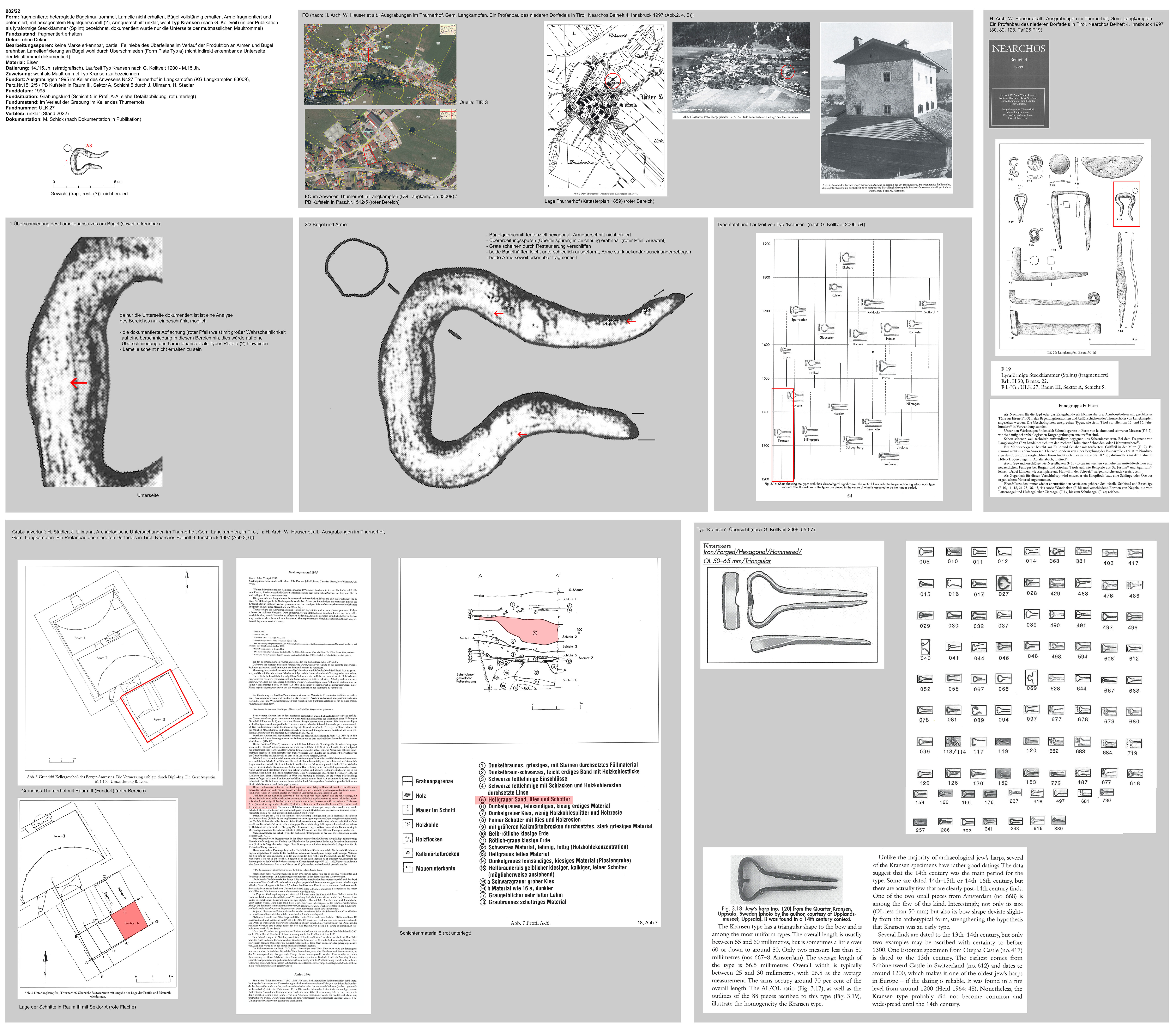 | 128/12 | Dreieckig oval ausgeformter Bügel, Armquerschnitt quadratisch, Bügelquerschnitt hexagonal, geschmiedet | Lamelle partiell erhalten, separat geschmiedet, an der Oberseite des Bügels durch Einklemmen fixiert (Typ a nach Plate) | vor 1504 | Burg Rotund, Taufers (I) | Burgareal, Grabungsfund | ohne |