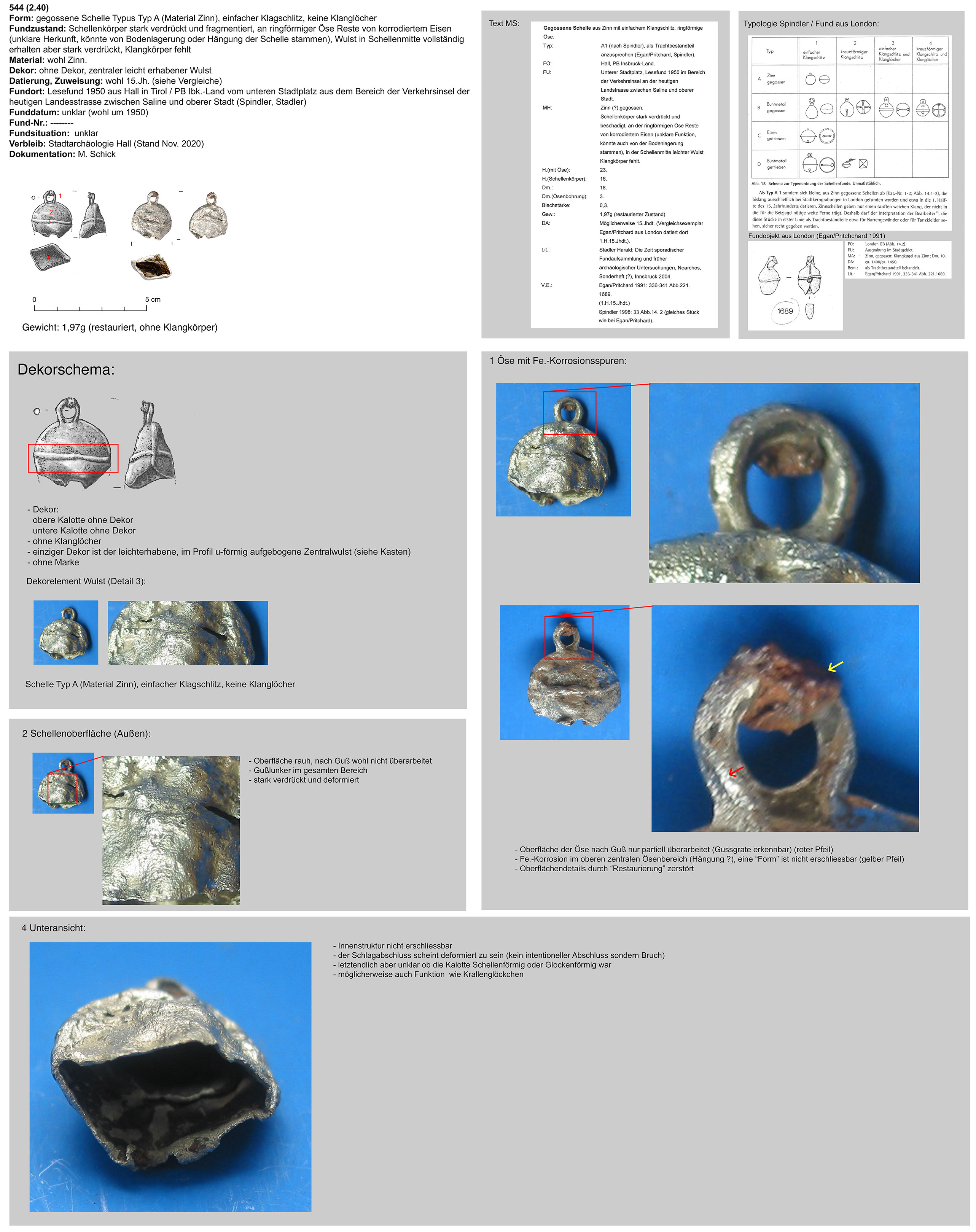 | 544 (2.40) | einteilig, zentraler Wulst, Öse ringförmig | nicht erhalten | MA (15. Jh.)? | Hall, Unterer Stadtplatz im Bereich der Verkehrsinsel an der heutigen Landstrasse zwischen Saline und Oberer Stadt | Stadtkern-untersuchung (Lesefund 1950)) | ohne |